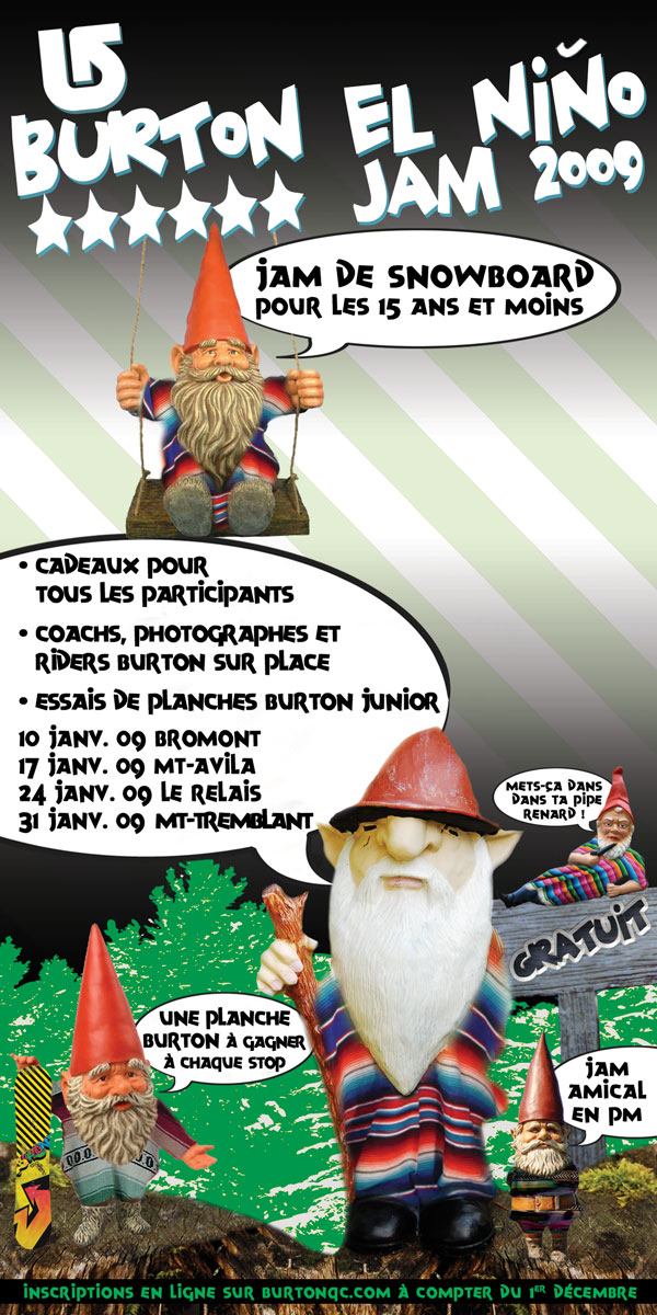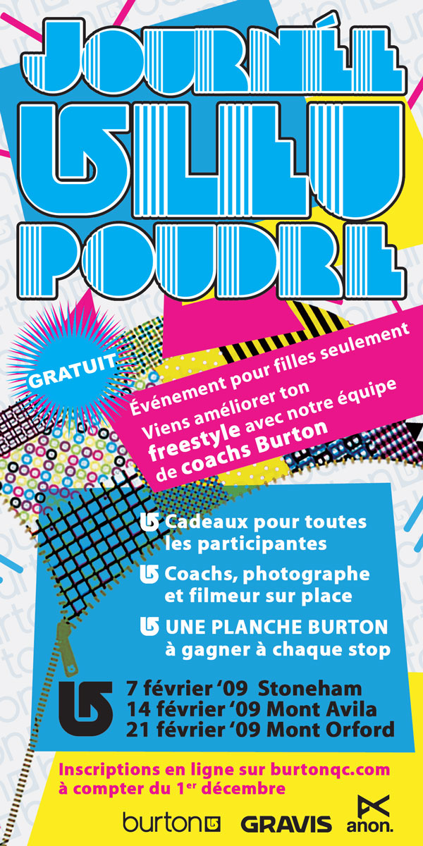 La tournée Burton El Nino Jam ainsi que les journées Bleu Poudre sont de retour cette saison ! La tournée El Nino est réservé aux jeunes de 15 ans et moins, jam amical en après-midi. Arrêts à Bromont, Avila, Le Relais et Tremblant. La tournée Bleu Poudre est réservés au filles et sera à Avila, Stoneham et Orford. C’est journée sont gratuites. Un board à gagner par arrêt. Des cadeaux pour tous. Présence de photographes et filmeurs sur le site. Coaching. Fiesta!!! Inscription en ligne ici.