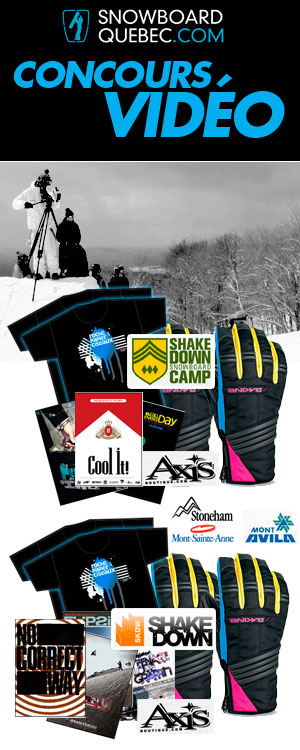 * SnowboardQuebec.com se réserve le droit de modifier ces règlements sans pré-avis. SBQ remercie les fournisseurs de prix pour ce concours ; Dakine, Shakedown, Axis Boutique, Rome Snowboards, Stoneham et Mont Sainte-Anne, MSSI, SugarShack, Sequence Films, Sandbox, Absynthe Films, Isenseven et SnowboardQuebec.com.