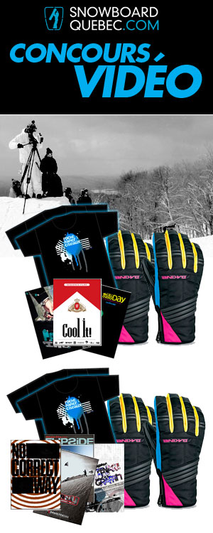 Vous aimez filmer ? Vous aimez être filmé en ridant ? Vous aimeriez gagner des prix grâce à une de ces deux méthodes ? Eh bien vous êtes chanceux car le site web officiel du snowboard québécois à organisé un concours pour vous. En effet, grâce à SBQ et son tout premier concours vidéo, vous pourriez repartir avec de beaux prix. Comment faire ? C’est simple, vous devez être un snowboarder avec un filmeur, et ensemble réaliser un petit montage vidéo. SBQ récompensera un rider et aussi un filmeur. Voici les détails de ce concours au talent…