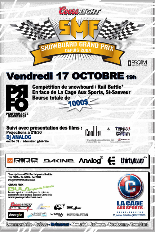 Pour de plus amples informations, consultez la page web du SMF 2008 sur SnowboardQuebec.com/SMF.