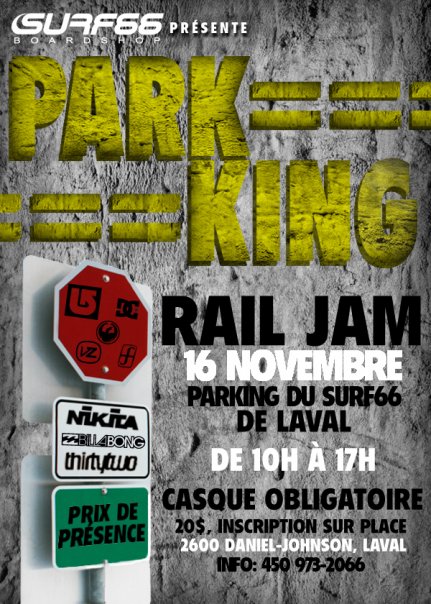 Surf 66 Boardshop présente ce dimanche 16 novembre, un rail jam amical dans le stationnement de son établissement de Laval. Dès 10h, venez montrer aux autres riders présents que vous n’avez pas perdus vos « bagel in » et vos « pretzel out » durant la saison morte. Inscription 20$, casque obligatoire et prix de présence, vous vous en voudrez longtemps si vous manquer cela!