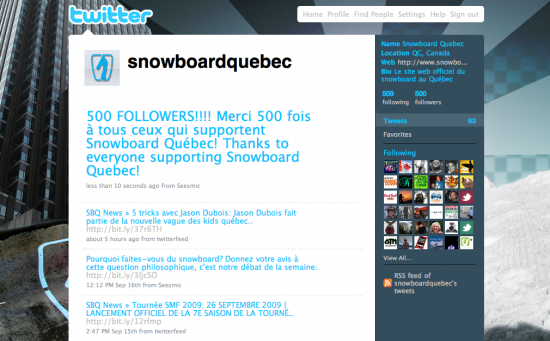 Snowboard Québec est fier de vous annoncer que nous avons atteint aujourd’hui la borne des 500 personnes qui suivent Snowboard Québec à la seconde près sur Twitter. Vous voulez faire comme nos 500 membres fidèles, vous voulez savoir toutes les dernières nouvelles, les derniers vidéos, les résultats de compétition live, les derniers « deals » sur l’équipement, les annonces d’événements de dernière minute, sur le snowboard au Québec et à l’internationale, et beaucoup plus encore? Si ce n’est pas déja fait, inscrivez-vous dès aujourd’hui sur Twitter, et ajoutez Snowboard Québec à votre liste de followers!