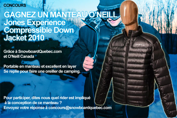 Concours. Gagnez un manteau O’Neill, modèle Jones Experience Compressible Down Jacket 2010. Cet item est portable en manteau et est excellent en layer. De plus, il peux se plier sur lui-même pour en faire une oreiller de camping.