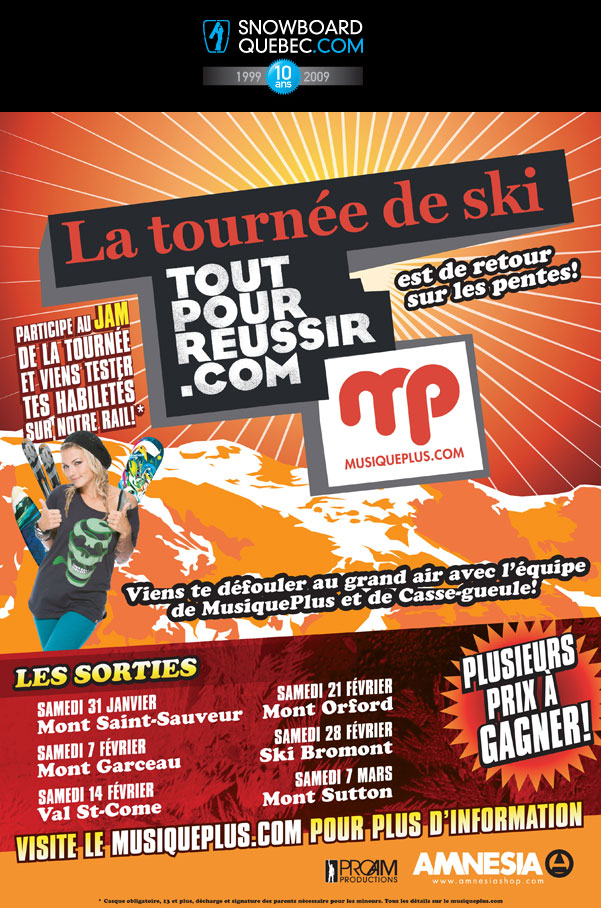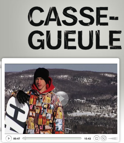 Le canal de télévision Musique Plus produit une émission nommé Casse-Gueule. C’est une tournée des stations de ski du Québec et un rider est invité à rider et à donner ses choix de musique, ses demandes spéciales. On y voit Guillaume Marquis au Mont St-Sauveur et Avila rider les rails et les jumps, se faire interviewer et commander les chansons de Notorious BIG et de Sans-Pression. Guillaume est un de nos rider du Team SBQ, il ride pour Capita, Union, Empire et SnowboardQuebec.com. Dans cette même émission vous y verez Dave Soulière présenter des bindings. L’émission est animé par Isabelle Desjardins.