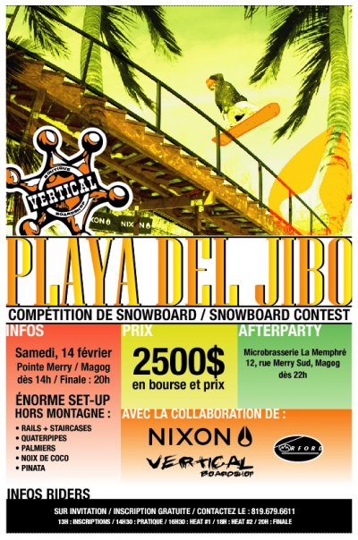 Une vague de chaleur déferlera en plein cœur de la ville de Magog le samedi 14 février prochain. Vertical Boardshop et Nixon présentent le Playa Del Jibo, une compétition de snowboard à saveur tropicale qui aura lieu entre les palmiers, les noix de coco et la pinata à la pointe Merry de Magog.