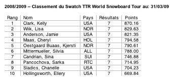 KELLY CLARK COURONNÉE CHAMPIONNE DU SWATCH TTR WORLD TOUR 08/09