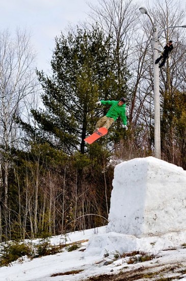 Cependant, rares sont ceux parmi nous qui ont eu la détermination de Guillaume Labelle. Armé de pelle, de râteau d’une paire de raquette et de ses connaissances (dans son quotidien, Guillaume est coffreur, il a donc été en mesure de se fabriquer une structure afin d’isoler son saut contre les trop nombreux redoux que nous avons rencontré cette hiver), ce dernier a du utiliser tous ses temps libres(et ses nuits d’insomnie) pour se construire un saut de 12 pieds de haut, 8 pieds de large.