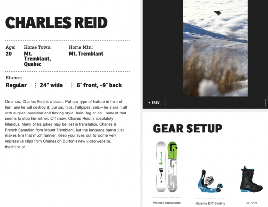 Notre team boy Charles Reid à reçu de la visibilité sur le site web de Burton la saison passé. Burton à remis ça avec lui encore cette saison. Si vous allez visitez le site web de Burton, tout récemment changé de look, vous pourrez y apercevoir du Reid par ici et par là.