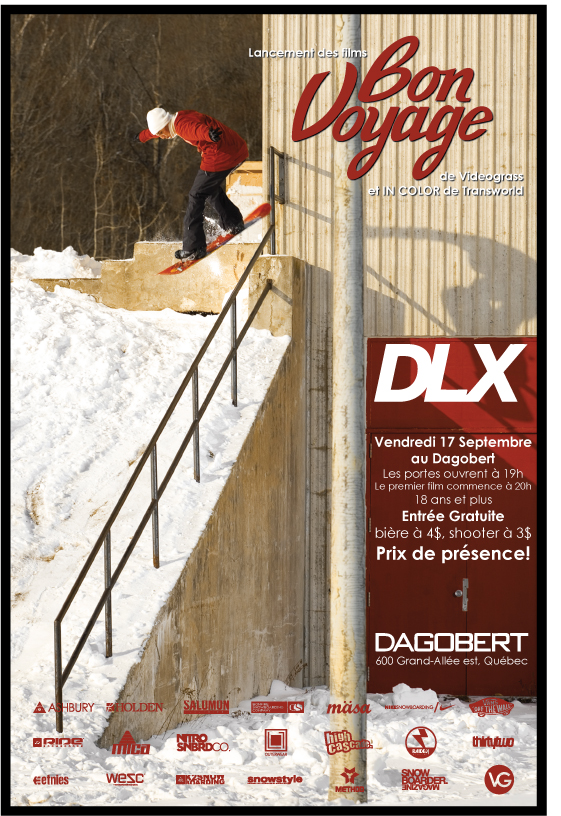 Le première du film Bon Voyage de Videograss à Québec est le vendredi 17 septembre 2010 au Dagobert (600 Grande-Allée est) et les porte ouvrent à 19h. C’est GRATUIT et c’est votre chumy et excellent rider québécois Louif Paradis qui vous invite à y être avec lui, so be there! ;-) Ce même soit sera aussi la première du film In Color de Transworld.