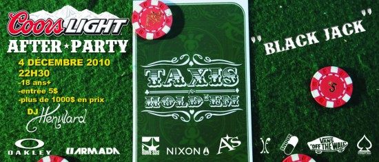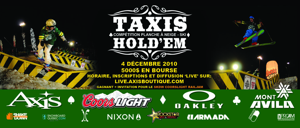 La compétition qui mélange les talents de jibber au talents de player est de retour au Mont Avila. Le Taxis Holdem, c’est le 4 décembre prochain. $ 5000 sont en jeux ainsi qu’un spot assuré pour le Shakedown rail jam. C’est le temps de miser le tout! Rendez-vous sur leur page pour les infos et inscription. Pour les fêtards, c’est à 22h30 que ça décolle.