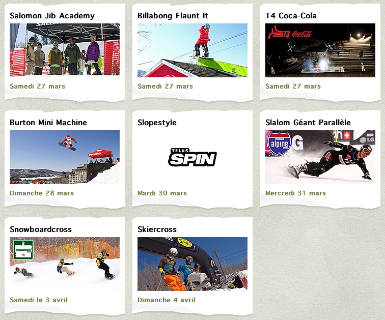 Les Championnats Canadiens de Snowboard auront lieu du lundi 29 mars au dimanche 4 avril. Snowboardcross, snowboard slopestyle et slalom géant parallèle sont au programme. Les athlètes qui, pour certains, ont eu la chance de se rendre aux Olympiques, termineront leur saison à Tremblant avec cette dernière épreuve du circuit canadien. Une compétition de ski cross clôturera le volet sportif le dimanche 4 avril.