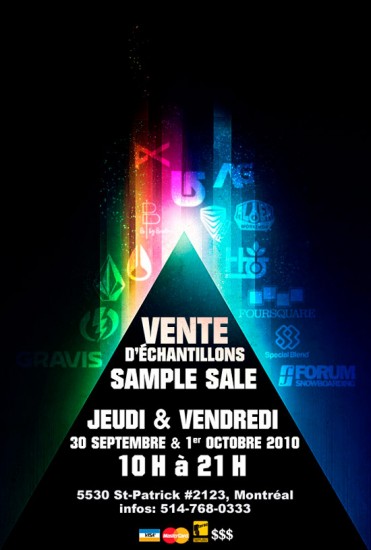 La très courue vente d’échantillons des marques Burton, Forum, Foursquare, Special Blend, Analog, Gravis, Volcom, Electric, Habitat, Alien Workshop, Red, Nixon et Anon est à nos portes. Des prix très alléchant seront offerts sur une grande sélection de manteaux, pants, planches, fixations, bottes, gants, tuques, montres, souliers, boardshorts, bikini, goggles et bien plus. Une vraie caverne d’Ali Baba!