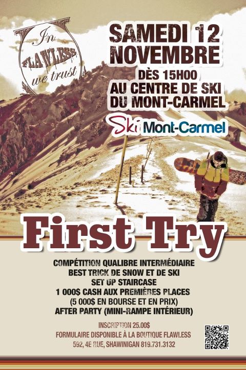 Le 12 novembre 2011 se tient une compétition de rail au centre de ski Mont-Carmel. 25$ l,entrée des riders, setup de marches, 1000$ au premier. Soyez-y dès 15h à Shawinigan. Party avec mini-rampe suivra l’événement.