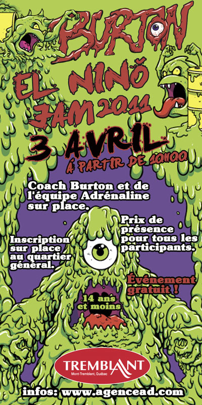 Le Burton El Nino c’est une journée de jam de snowboard dédiée aux juniors âgés de 14 ans et moins. Il y aura des coachs et riders de Burton sur place pour aider les jeunes. Inscription sur place au Quartier Général, lors du Telus Sikwam de Tremblant en date du 3 avril 2011 dès 10h. C’est gratuit et il y aura des cadeaux en plus.