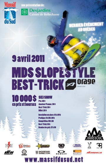 Les boys du Massif du Sud vous invites en grand nombre à leur plus gros événement de la saison, le MDS Slopestyle et Best Trick. Ça ce déroule le 9 avril, soit probablement le dernier événement de la saison 2011. Il y à un impressionnant 10 000 $ en prix et bourse à gagner. Le coût d’inscription est entre 10$ et 40$ plus le billet. Les inscription se font le matin même dès 8h, sur place. Les pratiques débutent à 8h30 et la compétition à 10h30.