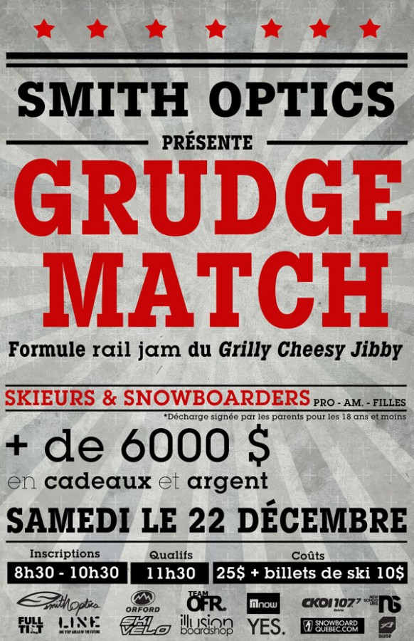 C’est le 22 décembre prochain que vous devez vous rendre à la station du Mont Orford pour participer à la nouvelle version du précédant Grilly Cheesy Jibby. Maintenant c’est le Smith Grudge Match. Encore une fois l’événement accepte le freeski comem le snowboard dans les catégories Pro, Amateurs et Filles. Plus de 6000$ en prix. Dès 8h30 le matin et ça coûte 25$ + 10$ de billet. Be there!