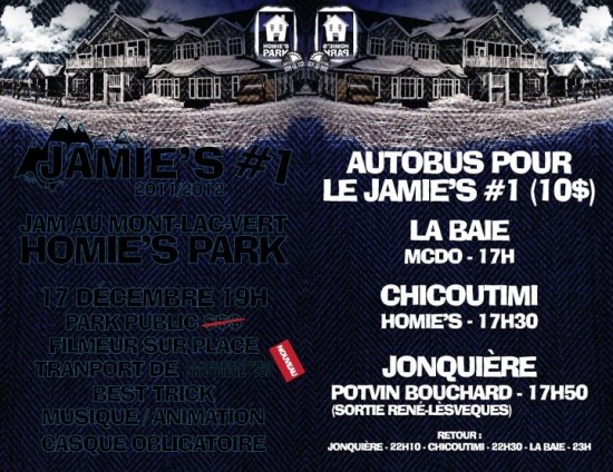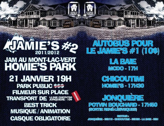 La boutique Homie’s vous invites à ces Jamie’s, soit des jam de snowboard au Mont Lac Vert. Sur place, des best trick, des prix de présences, de la musique et de l’animation. Les dates sont les