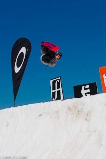 Rimouski, 25 Mars 2012 – Suite aux miracles de construction réalisés par l’organisation et ses bénévoles, qui ont dû faire face à des conditions estivales pendant la semaine des préparatifs, c’est Didier Godbout qui sort grand gagnant de la 7e édition du SNOWMISSION qui se déroulait le Samedi 24 Mars au Parc du Mont-Comi. Le planchiste de Salaberry-de-Valleyfield est repartit avec deux bourses : celle de la pole position d’une valeur de 7 000$ et 500$ pour un « Miller flip » sur le mur, qualifié de meilleure manœuvre en compétition. Jason Dubois se retrouve pour une troisième année consécutive sur le podium terminant 2e, accompagné de Thomas Folly qui complète le top 3. La cagnotte de l’événement se divisait jusqu’à la 5e place accordant ainsi à Ken Ohquist et François Bourgeois de compléter respectivement quatrième et cinquième.
