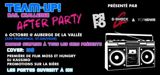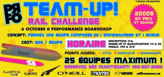 La shop Prfo vous invites le 6 octobre à un rail jam ski-snow tôt en saison derrière la boutique. 25 équipes maximum, doit être composé d’un snowboarder et d’un skieur (2). Le coût est de 80$ par équipe et c’est 2000$ en prix et bourse. Il reste seulement que quelques places alors faites vite!