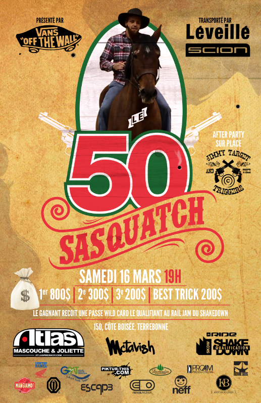 Le 16 mars à Terrebonne, il y aura un compétition de snowboard, le 50 Sasquatch. À 19h il y aura 1500$ en jeux plus un laisser passer pour le Shakedown. Regardez ce setup de fou!
