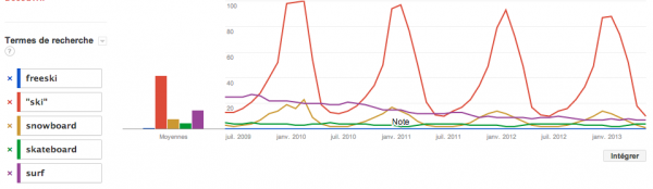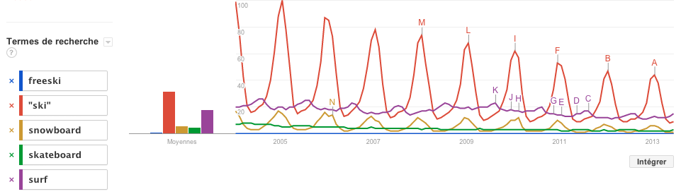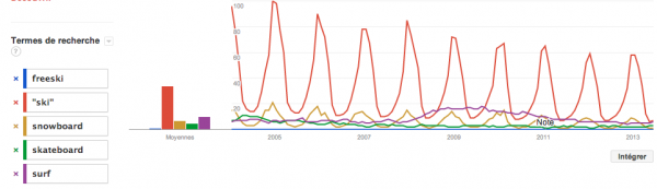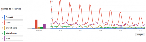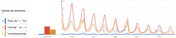 Alors voici un tableau que je vous ai créé selon les statistiques de Google, en nombre de recherches et popularité… de 2004 à 2013, donc sur 9 ans! Voyez les courbes de couleurs où le snowboard est en couleur dorée, le freeski en en bleu, le ski en rouge… et comparé au skateboard et au surf. Voyez que tous les sports de glisses connaissent une pente descendante, autant ski que snow. Notez aussi que la pente, depuis 2004, est légère.