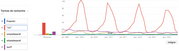 Ce tableau se voit encore plus précis sur les termes du mot « ski » dans le but de cette recherche. On y remarque que le niveau de quasi-égalité entre les deux sports a été atteint en décembre 2008. On y remarque aussi que les deux sports se suivent assez bien avec des pointes plus hautes et plus longues pour le ski et des baisses égales.