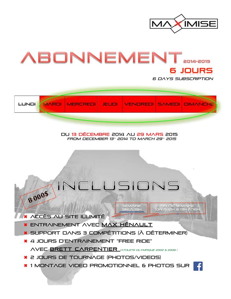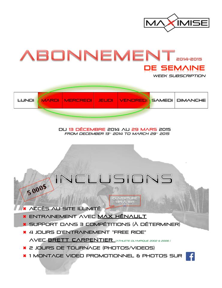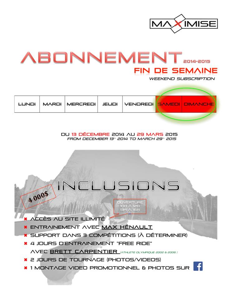 Voici le vétéran, mais toujours très actif, Max Hénault avec son vidéo démo filmé chez lui, dans son Maximise Snowpark à Sainte-Agathe-des-Monts. Max vous invite à vous abonner à un de ses plans pour cette saison, soit l’abonnement de fin de semaine ou celui à 1 jour semaine.