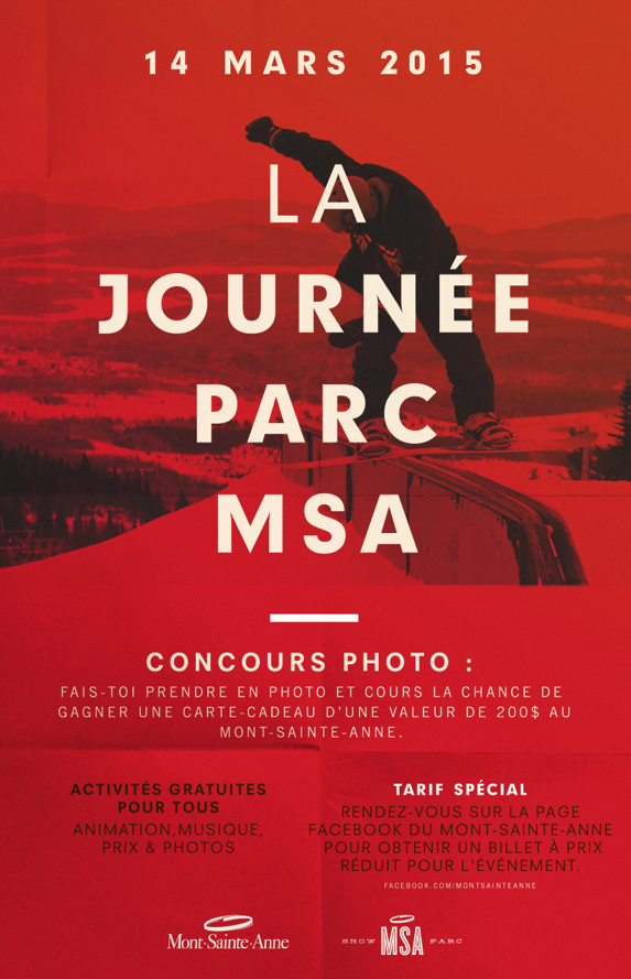 Samedi le 14 mars 2015 ce sera la Journée Parc MSA au Mont Sainte-Anne. Profitez de cette journée d’activités gratuite pour venir essayer le parc de la station. Concours photo, Rail Jam, Animation, Musique, un vrai party dans le parc à neige.
