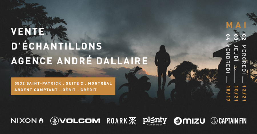 La vente d’échantillons est maintenant ouverte au grand public trois jours. Premier arrivé, premier servi. Même si c’est encore frisquet, c’est le temps de venir refaire ta garde-robe pour l’été! Vêtements prêt à porter, denims, montres, casquettes et accessoires. Seulement quelques places de disponibles dans le stationnement du Complexe Dompark (marquées des vignettes Vente d’échantillons Agence André Dallaire). Veuillez SVP, vous stationner dans les rues avoisinantes. Remorquage à vos frais.