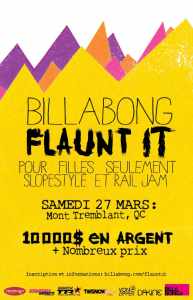 Le lendemain du Axis Slopestyle, le mont Avila de St-Sauveur reçevait les filles pour le rendez-vous annuel des féminin au Québec, le Billabong Flaunt It.