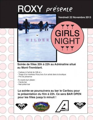 Roxy présente Girls Night le 22 novembre à la boutique Adrénaline de Tremblant Seulement pour vous mesdames… Le Vendredi 22 Novembre en collaboration avec Roxy