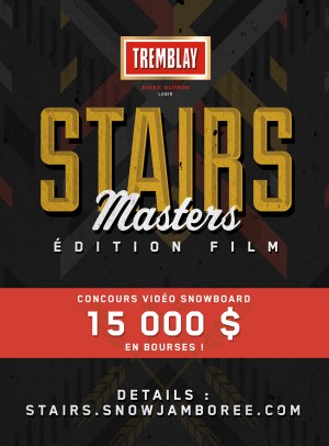 Le Snowboard Jamboree vous invites à participer au Stairsmasters édition vidéo pour une 4e année. Comme la compétition sur terrain, ce concours aussi accueil le